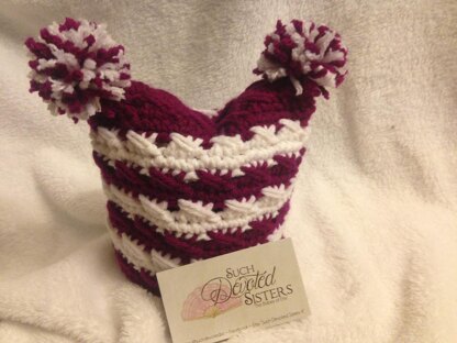 This hat is made with a simple, repetitive pattern worked in the round on both sides of a foundation chain. The textured stitch and the pompoms make this a festive hat for the big game or for your next photo shoot. Available in all sizes up to 12 months, the pattern includes a sizing chart so you can be sure to size your hat correctly for your little one.