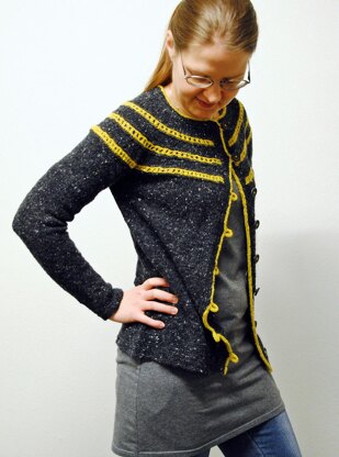 The little cardigan that goes with everything, perfect for any occasion. Add some interest to this wardrobe essential with a color popping yoke detail. Pontefract is worked from the top down in two colors. This simple cardigan features stripes of garter stitch and eyelets on the yoke. Short-row shaping is used to create a scooped neckline while waist shaping gives this hip-length cardigan a subtle hourglass curve. The garter-stitch front bands are finished with an attached i-cord edging and button loops, giving an edgy color pop to this otherwise streamlined cardigan.