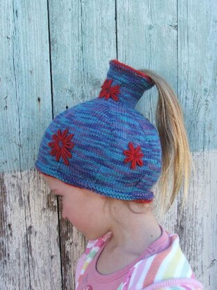 This is a reversible beanie especially designed for pony-tail wearers. It has an open tube (spout) at the top from which your point-tail can hang. The spout can sit up or be folded over.