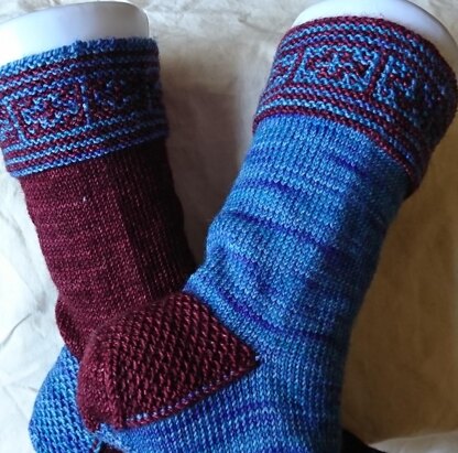 Pool Tiles socks will keep your feet warm while you dream of sunny days on the pool deck. Quick to knit with the stitch pattern at the cuff, the leg and foot are completed in stocking stitch. The contrasting garter eye of the partridge heel flap, Dutch heel turn and plain toe wedge add interest to the knitting. Pattern requires two colours with good contrast, solid and tonal colours work best.