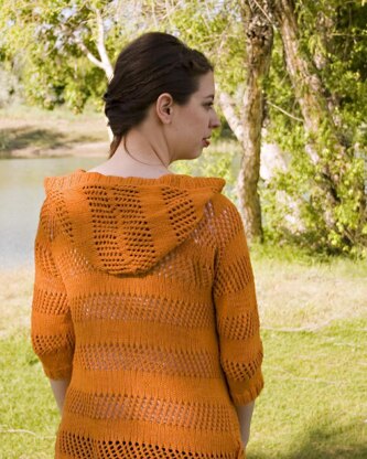 The Poole Harbor hooded pullover is perfect as a swimsuit cover-up or a breezy summer layer. Knit in a DK weight cotton-blend, the zigzagging lace stripes allow for warm summer breezes to flow through. Worked as a top-down raglan, the Henley neckline and side vents will show off some fun buttons. The hood is picked up from the provisional neck cast-on and worked last.