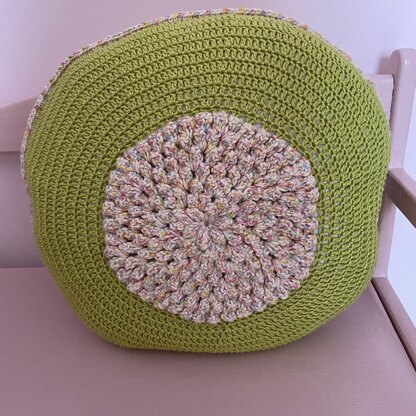 My popcorn round pillow is a large circle pillow with a popcorn stitch center. One of my favorite pillows that I have made is my pink ombre pops pillow; it is a square pillow with a popcorn stitch center, so I thought it would be fun to make an another one that is a round pillow! To ensure that the popcorn stitches pop, I combined two different yarn weights for this pillow. The popcorn center is made with Cascade Nifty Cotton Splash yarn in the shade candy. It is one of my favorite yarns! It is medium weight yarn; however, it is a very light weight medium yarn, so I would make a gauge swatch (17 sts in 8 rows = 4 inches with double crochet stitches). The green is Cascade Ultra Pima in the color chartreuse. I used two skeins of it, and it is DK weight yarn. You will also need an 18 in round pillow insert and 5 buttons which allow the pillow to be taken on and off of the insert. There are some pictures included throughout the written pattern to help you. I hope you enjoy the pattern!