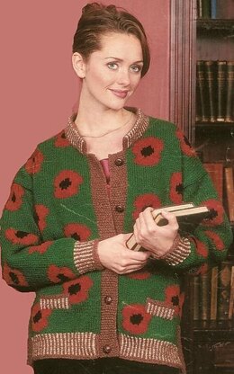 This oversized box jacket in two sizes, has dropped sleeves, stand up collar, side slits, pockets, textured rib at collar, cuffs, pocket tops and welt, with moss stitch front bands and button closure. The garment is knitted flat, has side, sleeve and shoulder seams with stitches picked up to complete pocket tops, front bands and self lined collar. The jacket features intarsia poppies as shown in the swatch or may be worked in a solid colour by simply omitting the poppies and ignoring any reference to chart placement. If you prefer, you can of course replace the poppies with any motif you like. The original yarns are now discontinued substitutes are suggested here but, as always, do swatch.