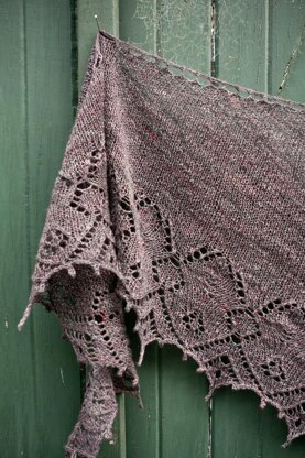 Poppy Seed is an easy top down crescent shaped shawl with a large stocking stitch section and shallow lace border, designed to highlight the beauty of variegated handspun yarn, which is otherwise lost in more complicated stitch patterns. Knit in Ashford's delicious Merino/Silk "Poppy Seed" sliver, the resulting shawl is a delightfully rustic little beauty.