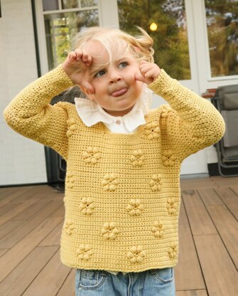 Soft cotton yarn keeps it cozy but not heavy, perfect for everyday wear, playdates, or a sweet outfit for a special occasion. With its neat fit, tapered sleeves, and flower details carried through to the cuffs, this sweater will quickly become a favorite layer in your child’s wardrobe.