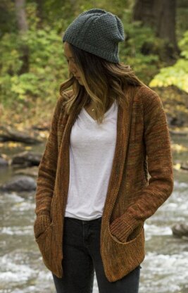 Portage is a comfortable, top down raglan that is worked flat. The sleeves are worked in the round. Only a small bit of seaming is required to attach the deep pockets to the hem.