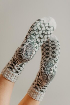 The yarn used in the sample (size 2) is 1 ball of Regia Premium Silk 4 ply Sock Yarn (55% wool, 25% polyamide, 20% silk; 400 m 437 yds / 100 g) in colourway Linen Mix (#005) as main colour and 1 skein of Malabrigo Sock (100% wool; 402 m 440 yds / 100 g) in colourway Primavera as contrast colour.