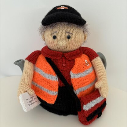 The main cosy body is knitted using 2 strands of DK held together. All other pieces are single strand DK. You will need between 15-30g of yarn in the various colours. and toy stuffing. Optional items: safety eyes, clear adhesive and 3 small buttons. The badges are cut from a post office leaflet and glued in place.