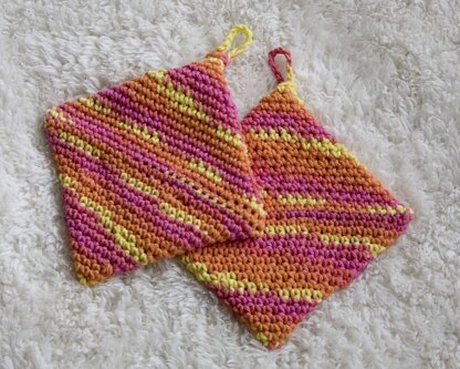 My great grandmother made these potholders for every one in my family, but I never asked her how to make them. Years later I wanted to make a set for a friend and could not find a pattern anywhere online. So I studied one of hers and came up with this pattern. It is so simple to make and after the first one you don't even need the pattern, just turn your favorite movie on and crochet away.