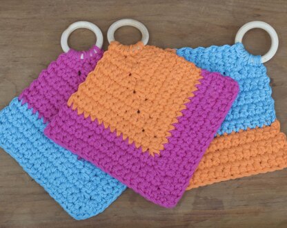 These bright, contemporary potholder would be fun in your kitchen or as a cute hostess, housewarming or shower gift. The wood rings make them easy to hang and add to the modern look. They can also be used as coasters.