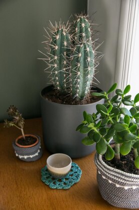 Simple crochet pots. Large approx 19cm (71/2in) wide and 10cm (4in) deep = 2 x 50gm Medium approx 17cm (63/4in) wide and 15cm (6in) deep = 2 x 50gm Small approx 9cm (31/2in) wide and 8cm (31/4in) deep = 1 x 50gm