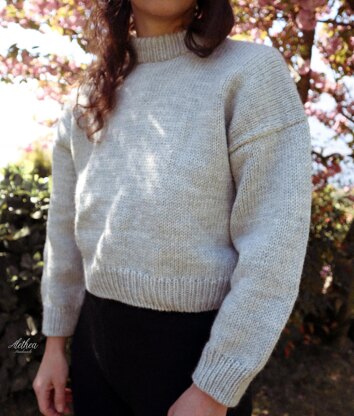 The Prairies Sweater is a basic drop shoulder sweater. It has a boxy and a more fitted to the body look, thanks to the tighter ribbing at the hem and cuffs and a folded collar.