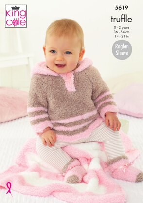 Pram Blanket, Cardigan, Hooded Top, Hat & Socks in King Cole Truffle DK - 5619 - Downloadable PDF is a Intermediate Knitting pattern by King Cole, available as a Downloadable PDF and includes instructions in English. Super fun to make, this pattern could be your next masterpiece!