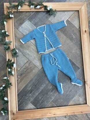 The pattern is to make a crocheted cardigan and leggings. The cardigan and leggings are designed to fit a 3-6 month old baby. The pattern uses 3.5mm and 4mm hooks and DK.