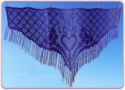 God Is Love - Prayer Shawl Pattern and ChartsA Filet Crochet Pattern that you make using medium worsted weight and basic crochet stitches to create a beautiful and inspirational prayer shawl. I used Red Heart Super Saver - Ombre - Violet in the shawl pictured, and 'I love this yarn' white with silver strand through it in the other photo, but any medium worsted weight yarn will work. Size: 72" wide by 34" length**This pattern includes:**Supply list Easy to Follow Instructions on how to Filet Crochet A Stitch Design Placement Grid Chart. A Stitch Chart - Row by Row in crochet symbols. The first 23 rows written out row by row, to help learn how the simple design chart works. A simple border (optional) suggestion with instructions and diagrams. How to apply fringe (optional) A photo tutorial on how to block (optional).