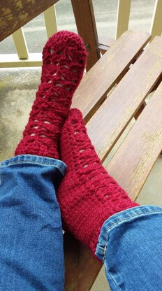 Dress up your feet while keeping your sole toasty and protected from cold floors. Toe-up design utilising linked & centre stitches to create a perfectly straight & solid sole, while forming lacework for the top of the foot. Each round is half solid and half lacy. Slightly shaped tube sock; make longer/shorter.