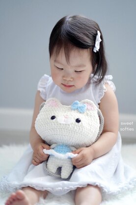 Crochet an adorable crossbody bag that looks like a huggable amigurumi doll! This fun, animal themed purse is in the shape of a kitty cat wearing a cute dress and a bow on her head. It is easily customizable with different yarn colors and appliques. It is unisex as you can also turn the doll into a “boy” version by leaving out the dress skirt portion and changing yarn colors to create the look of pants and a shirt. It is almost a no-sew project as the legs, body, dress, head, and straps are all made without any sewing. The only parts that are attached at the end include the arms and the bow, making it quite beginner-friendly. This sweet and easy pouch works up quickly using super bulky velvety yarn, and can also be substituted with other chunky yarn (e.g., blanket yarn). Crochet this trendy accessory as a gift for kids of all ages, from toddlers and children to teens! Even adults, such as cosplayers or those who love the kawaii aesthetic, will enjoy this cute purse!