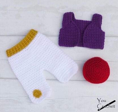 ♥ Aladdin set ♥ Written in English using US crochet terms. This is a crochet pattern not the finished product. Cute set makes a great photo prop and a wonderful baby gift. Directions for the hat, waistcoat and pants are included in 3 different sizes. Made using aran weight yarn. SIZES included in the pattern: Newborn 0-3 Months 3-6 Months Yarn suggestions are given in the pattern. This is not a difficult pattern but you will need to be familiar with basic techniques and stitches. This pattern uses front and back post stitches. The trousers and top are worked in HDC st and instructions are included to show you how to avoid the slanting seam when working in HDC.