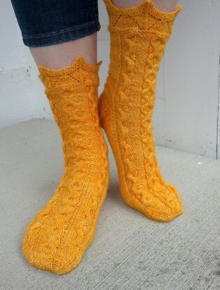 Inspired by Princess Buttercup from the book and movie, The Princess Bride, these socks start with a crown cuff denoting her princess status as bestowed by Prince Humperdinck. The cables in the front of the leg are reminiscent of her long, flowing hair. The back of the leg has a simple braid down the center, as Buttercup obviously braids her hair to create the golden waves with which we often see her.