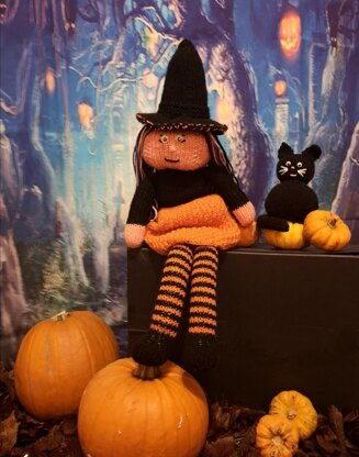 Priscilla the Pumpkin Witch is a cuddly ragdoll and perfect for children to snuggle with. She comes complete with her own black cat, Pudding (Pud) the Cat. They love going out on adventures together, expecially at Halloween, and Pud is very partial to a piece of treacle pie after his travels!