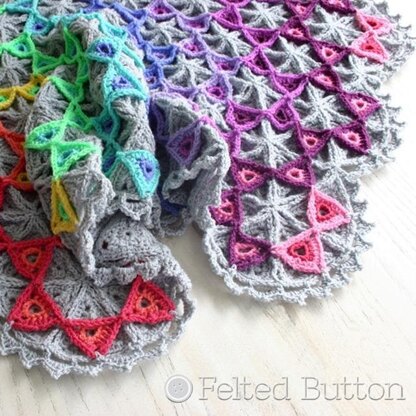The blanket is constructed by the joining-as-you-go of the base triangle motifs with the top triangles attached to the base and then joined to each other before being bordered.