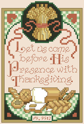 Designed by: Sandy Orton. This classic Americana sampler style design says it all: “Let us come before His Presence with Thanksgiving.” The bountiful harvest of wheat and nourishing bread that it brings is represented in the design which captures the spirit of the verse.