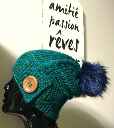 Autre / Other 2 marqueurs / stitch markers, 1 aig à torsade/cable needle, 1 aig à laine/tapestry needle, 1 ponpom et 1 bouton/button 45mm (1 3/4‘’)