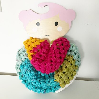Make this bold and colourful cowl featuring the textured puff stitch which creates a lovely zig zag pattern. Fits a child with two wraps around or an adult with one.