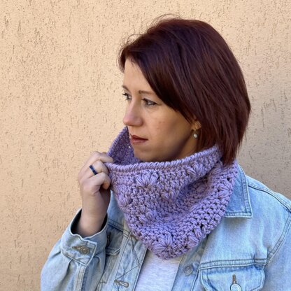 A feminine crochet cowl, easy enough for advanced beginners to try, as the pattern is only using a few different stitches. The yarn is held double stranded for extra coziness and warmth.Difficulty: Advanced Beginner/IntermediateFinished Size: 24 cm/9.5” wide 70 cm/27.5” circumference Special thanks to my tester: Rebecca UrrutiaMaterials needed:• 6 mm (J) size hook • 2 skeins of Hobbii Rainbow Sock Wool 8 ply (I used Light Lavender-(38) shade) • Yarn needle for weaving in ends • Scissors • Stitch markers (optional)Gauge: not critical for this project but may affect the yarn quantities required 12 STS and 6 rows = 4" x 4” / 10 x 10 cmIMPORTANT: The yarn has to be held double stranded throughout.US terms used throughout.THIS IS A WRITTEN PATTERN ONLY WITH NO CHART
