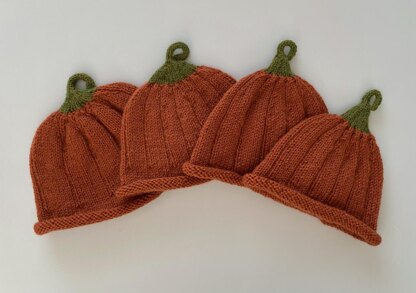 This is our pattern for a handknitted beanie style hat, with rolled brim, wide rib to create pumpkin ridges, and double decrease and cord used to create stem.
