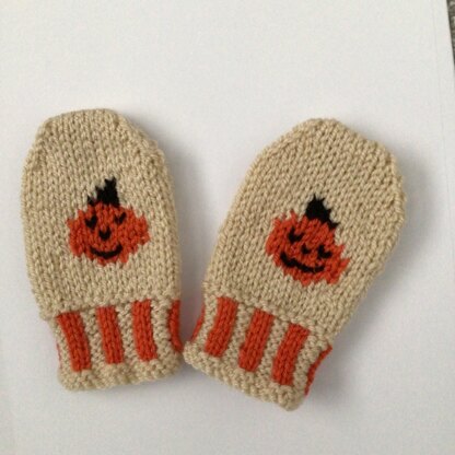 These cute little mittens are such fun and will keep baby's hands lovely and warm. Worked in one piece for less seams. The cuffs are a little longer than normal to help keep them on. I have not done a cord but you could make one and sew to each mitten. If you enjoy making these have a look at the pumpkin baby beanie that matches in my pattern store. Although I have said it is a written pattern, I have added the chart for the pumpkin face if you prefer to work with charts. The pattern is for 3 sizes but if you wanted larger mittens you could use thicker yarn and larger needles as this works. You only need odd bits of black yarn for mouth and eyes and approx. 15 - 20 yards of DK Pumpkin