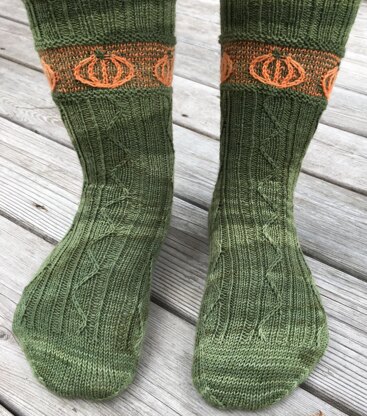 Cheerful slipped-stitch pumpkins add a touch of whimsy to the legs of these socks. Wavy cables in the ribbed portion keep the knitting interesting and gently suggest vines.