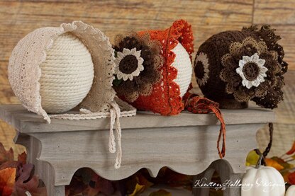 Crochet a lacy, fall-themed baby bonnet for your little one! Add a rosette embellishment (instructions are included), or leave the bonnet plain.