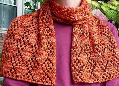 A bold pattern of solid diamonds alternating with openwork ones keeps the eye bouncing along this cheery scarf. Knit it up in a soft, bright colorway for fun, or choose a darker, springier yarn for a sleek, elegant effect. The easy-to-learn motif has simple lace knitting on RS rows only, making this a great project for knitting along at sporting events.