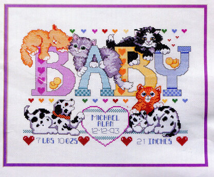 Designed by: Linda Gillum. Treasure forever memories of a baby girl or boy with this easy-to-stitch counted cross stitch design from the Kooler Design Studio Collection. These adorable pets make a great addition to any nursery decor! Includes a full alphabet for customizing with baby's name.\n