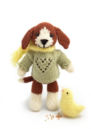 A sweet little puppy, who looks a bit like a beagle and a bit like a border collie, but is cute either way! The toy and pullover are knit flat, then seamed and assembled. The face has some simple intarsia, but it's quite easy to leave out, and you can even knit the whole toy in a single colour for a different look. For a young child, embroider the eyes instead of using safety eyes or buttons.