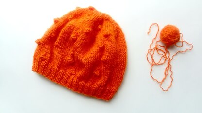 The background of this hat is stockinette stitch and I have created alternate columns of little bobbles that make it stylish and funny at the same time. The top is very symmetrical so that the design continues right up to the top. The brim is knitted in rib stitch, it's tight and stretchy and it doesn't get blown away in case of strong wind. For this hat I used 100% wool and it is very warm and soft at touch, to make it the perfect garment to face the coldest winter.
