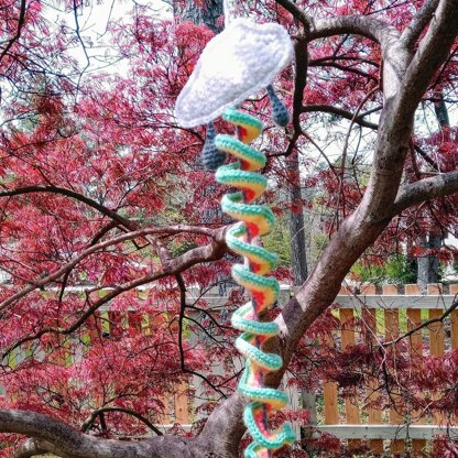 The length of the wind spinner can be adjusted by adding or subtracting your starting chain. Two identical clouds are made and stuffed while being joined together. Raindrops are then worked in the round, stuffed and attached.