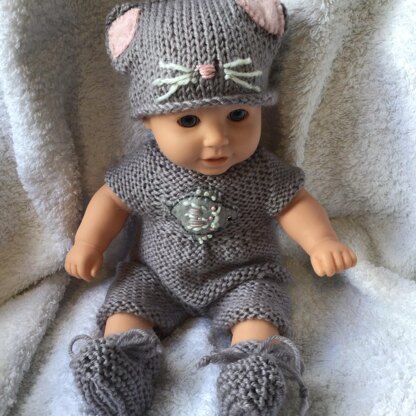 Puss in Boots outfit has a cute romper suit knitted in one with a fish embroidery on front. The hat has cute ears, nose and whiskers embroidered on the front. The grey boots finish off the outfit. It is all knitted flat with easy to understand instructions. I use paintbox yarns for my projects.