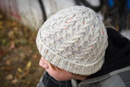 Get your knit game on with this biased cable toque. Be wary though, cause as the cables spiral up towards the crown, the start of round moves about often, in a knitting tug of war!