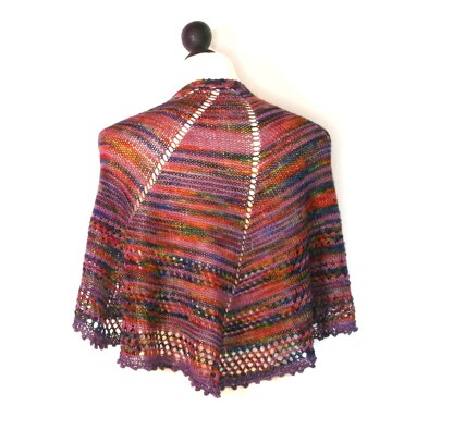 This pretty shawlette uses a fingering weight set from Dystopic Fibre. One 100 gram skein in shades of the wrappers from the chocolate box and a mini skein in the shade of the big purple one. Worked top down with eyelet/yarn over increases and two lace patterns, then a picot bind off.