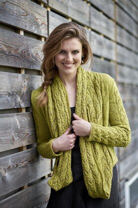 A combined lace and cable stitch pattern adorn the back, sleeves, and the generous loop closure on this straight cardigan named after a beautiful elf. The loop collar can be worn loose, folded once behind the neck or twice in front or three times around the neck in a ballerina style. A fake garter stitch seam add a bit of structure to this cardigan. I knitted it in the luscious wool and silk mixture Zenta by Permin.