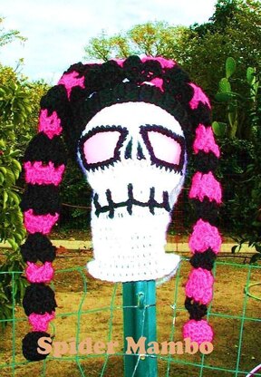 Queen Of Hearts Harlequin Hat. The size is determined by hook size. Child G hook, Adult S I hook, and Adult M, K hook. American crochet terms. Pictures of many of the steps. A small amount of fiberfill is needed for the dingle balls at the tips of the hat.