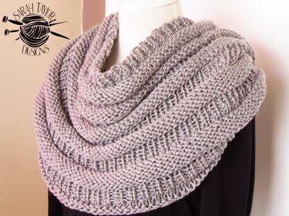 The pattern is for one size, which will fit most people, with the circumference measuring approximately 41” (104 cm) around, and 17” (43 cm) long. There is a lot of stretchability in the finished scarf due to the stitch pattern, so it can also be pulled up over the head to be worn like a snood, or pulled down over the shoulders to be worn like a ponchette.