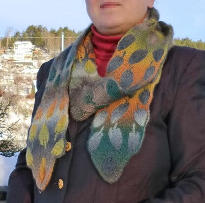 I found inspiration for this scarf in the Reckoning of Rivendell, which is the calendar of the Rivendell Elves in J R R Tolkien’s legendarium. Quellë was the Quenya name for “fading”, or late autumn; it was the fourth of the six “seasons” in the Reckoning of Rivendell. It was also called Lasse-lanta or “leaf-fall”. Quellë corresponded to the 54 days between modern 8 October and 30 November. In Sindarin, Quellë was called Firith and Lasse-lanta was called Narbeleth (which meant “sun-waning”)