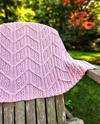 Quietude is a modern spin on the traditional cabled blanket. Cables flow in and out of ribbed columns, creating chevrons across the surface of the blanket, while eyelet cables lend a more delicate feeling to the finished fabric. Garter stitch ensures that the blanket edges lie flat. A solid or mostly solid color of yarn works best to highlight the rich texture in this design.