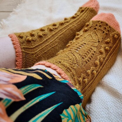 Techniques used : Socks are knit cuff down / Picot border cuff / Lace panel mirrored / Lace with eyelets, simple and centered double decreases / Bobbles (video tutorial included) / 3 sts cables over a purl background / 2 heel options : Heel flap + gusset / German short row heel / Rounded toe with simple decreases / Grafting / Pattern includes charted and written instructions Pattern in Engish and inFrench (from page13)