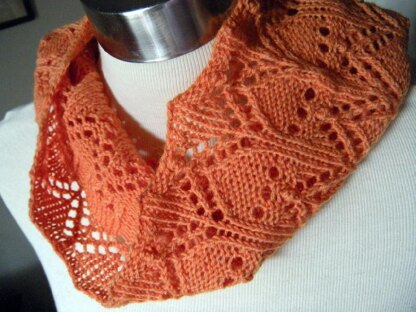 The cowl is made with a lace pattern that uses twisted knit stitches, yarn overs, twisted decrease stitches, double decreases, and bobbles. All unusual decreases are described in the pattern. The cowl is cast on along the circumference edge and joined to work in the round.