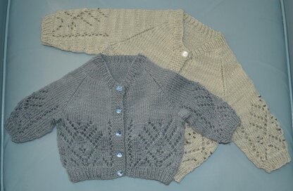 This is a sassy little sweater for the tiny princess in your life. The cardigan pattern is for two sizes spanning 0 to 18 months. Larger size is accomplished by using heavier weight yarn and bigger needles. The pattern is the same for both sizes.
