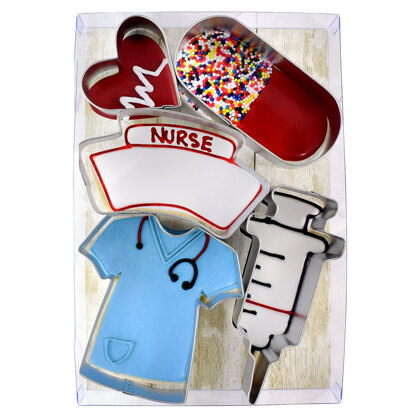 Nurse your friends and family back to health with R&M’s Nurse Cookie Cutters Set of 5. These high-quality cutters are a great way to thank a nurse, or have a hospital-themed party. Made from tinplated steel, they are perfect for baking biscuits and cakes, even crafting. Includes a pill, syringe, nurse hat, t-shirt and heart.